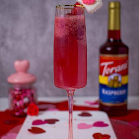 Muddle strawberries and mint leaves in a glass. Add Torani syrup, lime juice and stir. Add ice and top with sparkling water and garnish with strawberry hearts and a mint sprig. Enjoy!