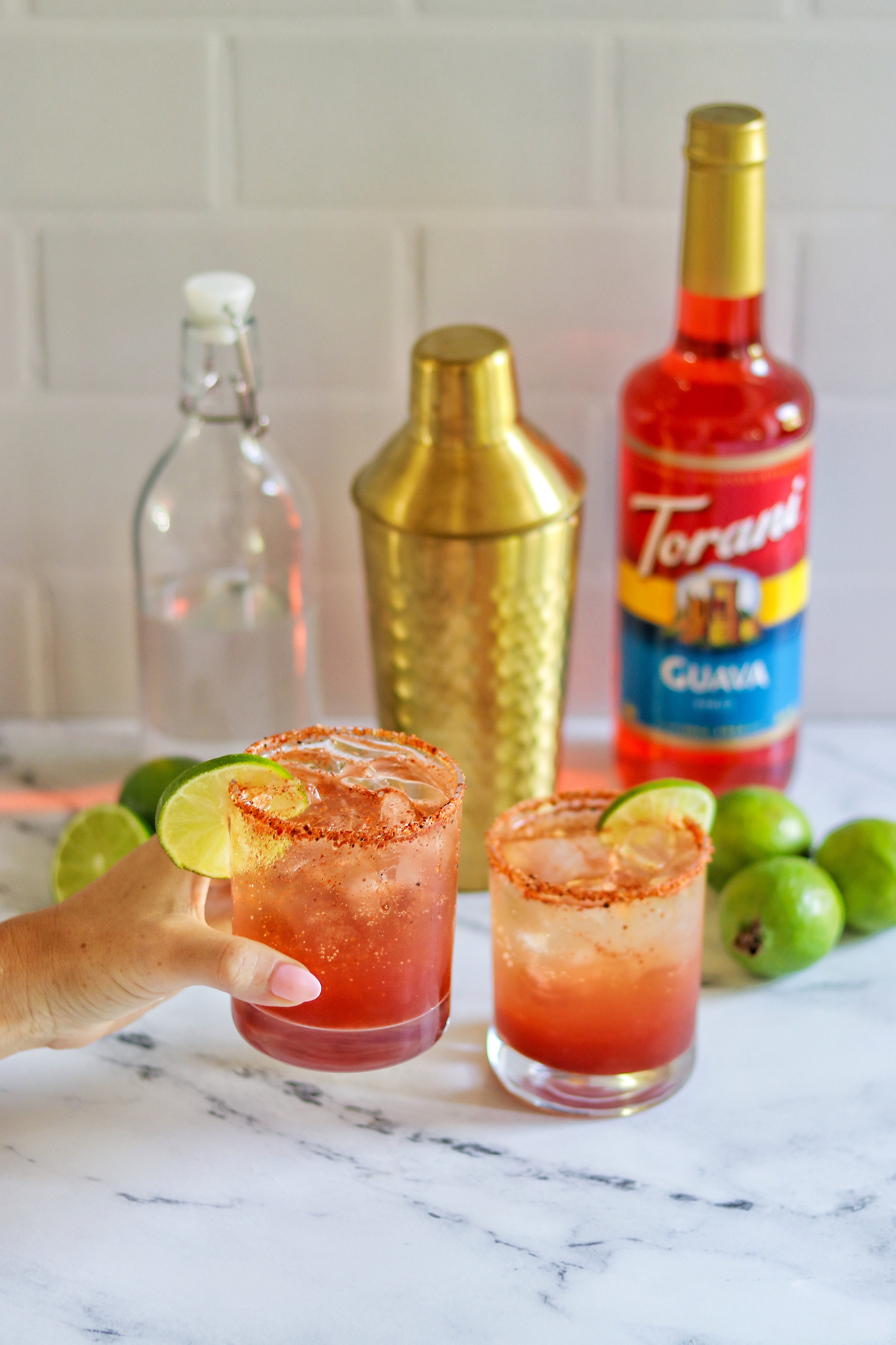 Add Torani Guava Syrup, 1 ounce lime juice, and chili powder to a cocktail shaker filled with ice. Cover and shake until the ingredients are well mixed and chilled. Place additional lime juice on a small saucer or plate. Place the chile-lime seasoning on a separate small plate. Dip the rim of a rocks glass in the lime juice, followed by the chile-lime seasoning to coat the rim. Pour ice into the glass, then pour the guava mixture over the ice. Top off with mineral water and stir gently. Garnish with lime wheels. Recipe: Ramona Cruz Peters, @fabeveryday
